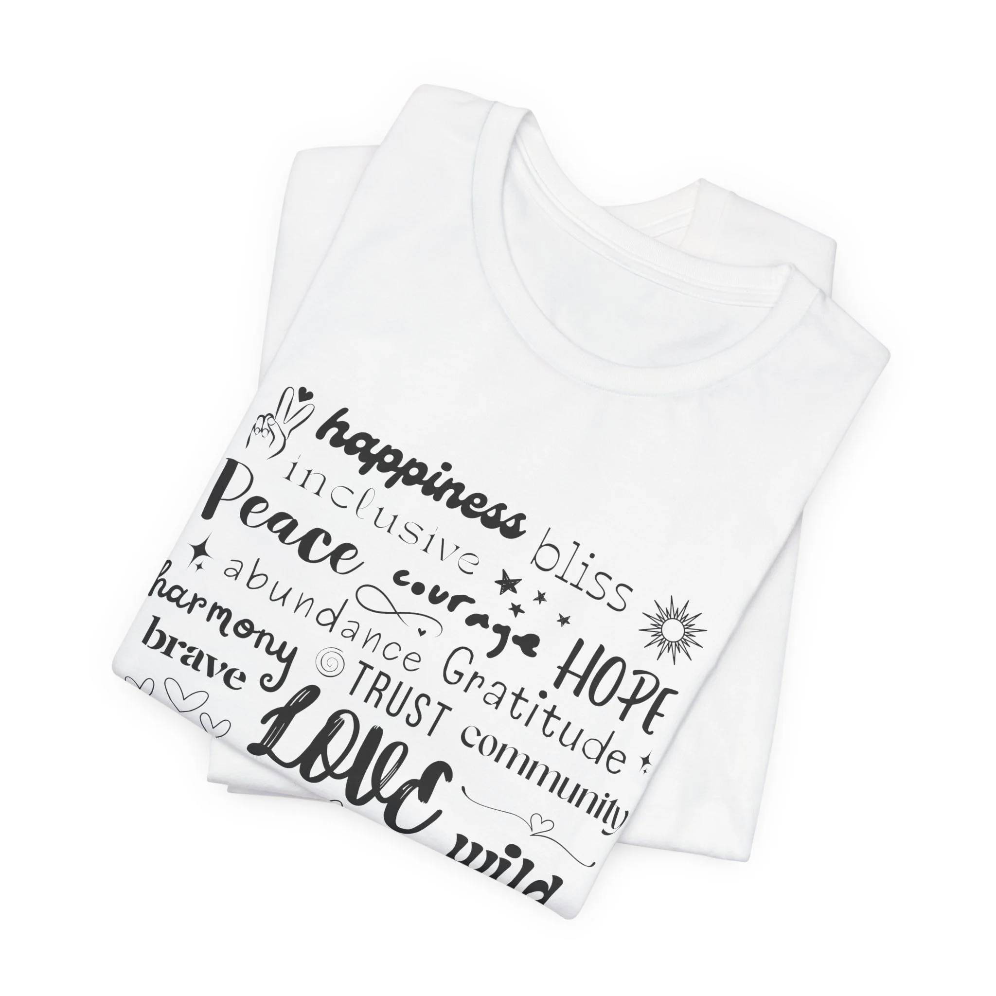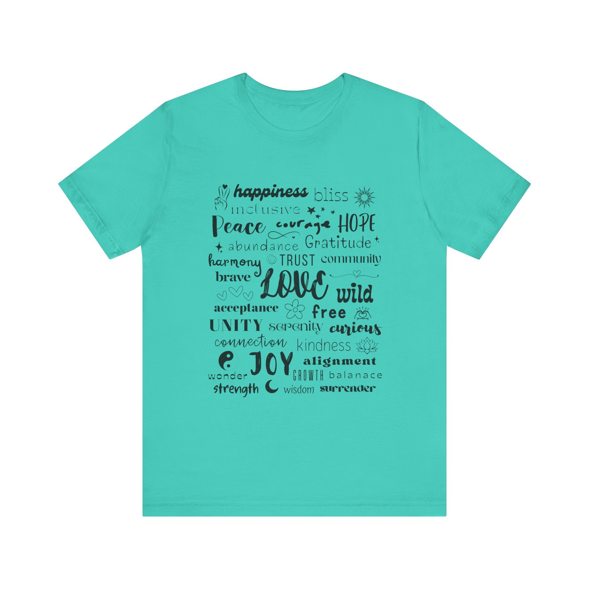This unique shirt is covered in powerful, heartwarming words like love, peace, joy, community, hope, and strength — all thoughtfully designed to keep your vibes high and your heart open. Whether you're out making magic or just chilling with your crew, this tee is a wearable reminder that positivity is contagious (in the best way!).
